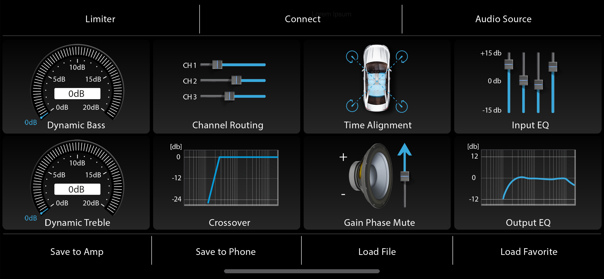 Každý kanál DSP je samozřejmě vybaven parametrickým 15pásmovým ekvalizérem, crossovery až do 24 dB/okt, časovým vyrovnáním a fázovou korekcí. Vylepšený crossover nyní nabízí tři charakteristiky filtru: Butterworth, Linkwitz a Bessel.