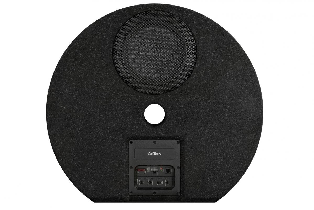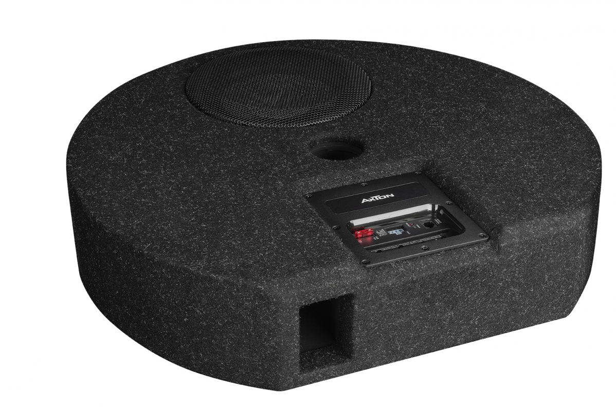 ATB20RXF od AXTONu je kulatý, extrémně plochý subwoofer do prostoru pro náhradní kolo. S výškou pouhých 125 mm se tento model vejde do téměř každého prostoru pro rezervní kolo současných aut. Sofistikovaná konstrukce kombinuje stabilitu, minimální nároky na prostor a nízkou hmotnost ve výkonný design produktu s působivou kvalitou basů. Modul zesilovače s výkonem 100 W RMS je chytře umístěn na horní straně subwooferu. To znamená, že lze pohodlně nastavit vše, od low-pass filtru, fázového posunu a citlivosti až po bass boost. High-level vstupy s funkcí automatického zapínání jsou praktické při připojení k originálnímu rádiu (bez výstupu REM).