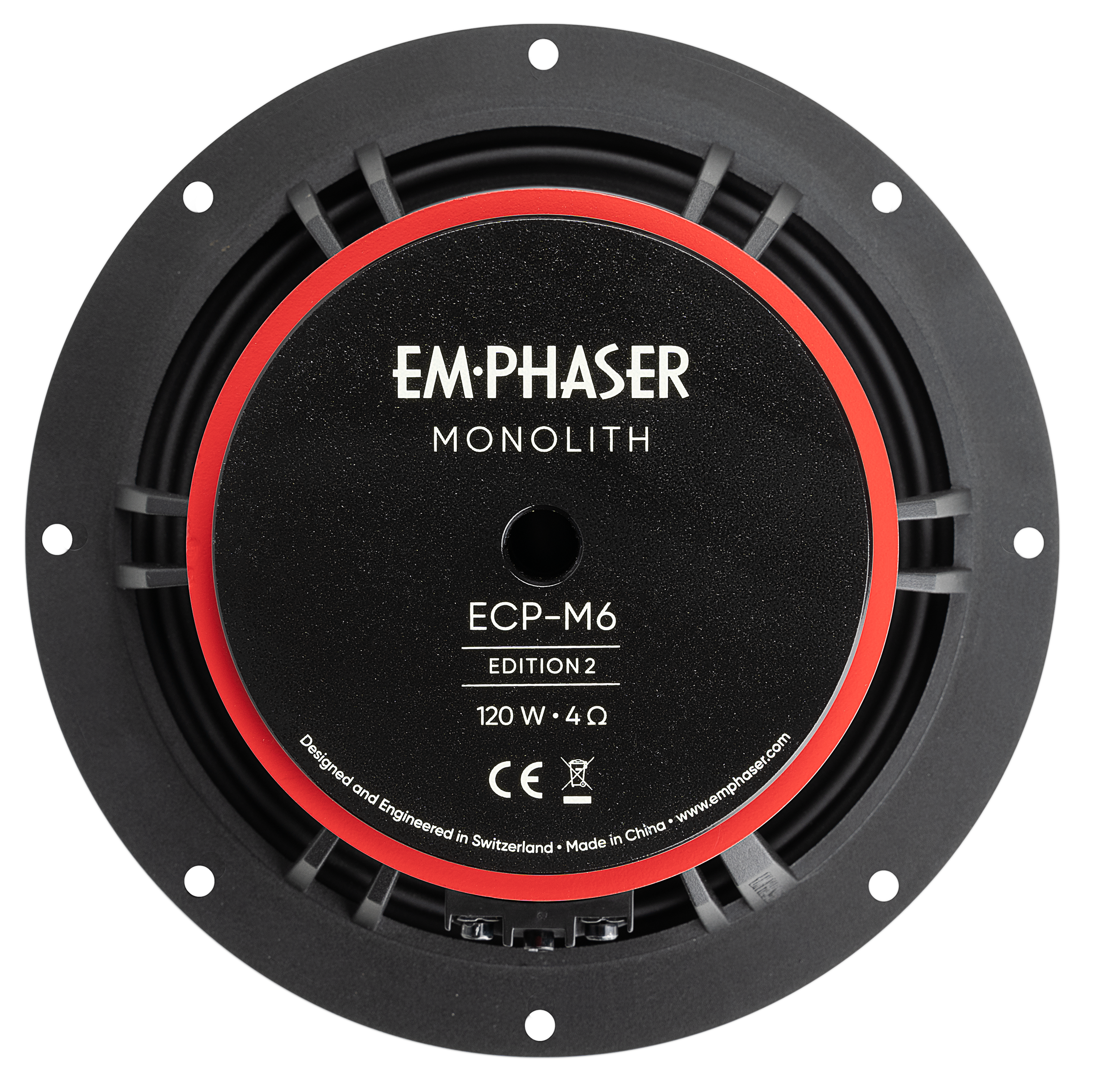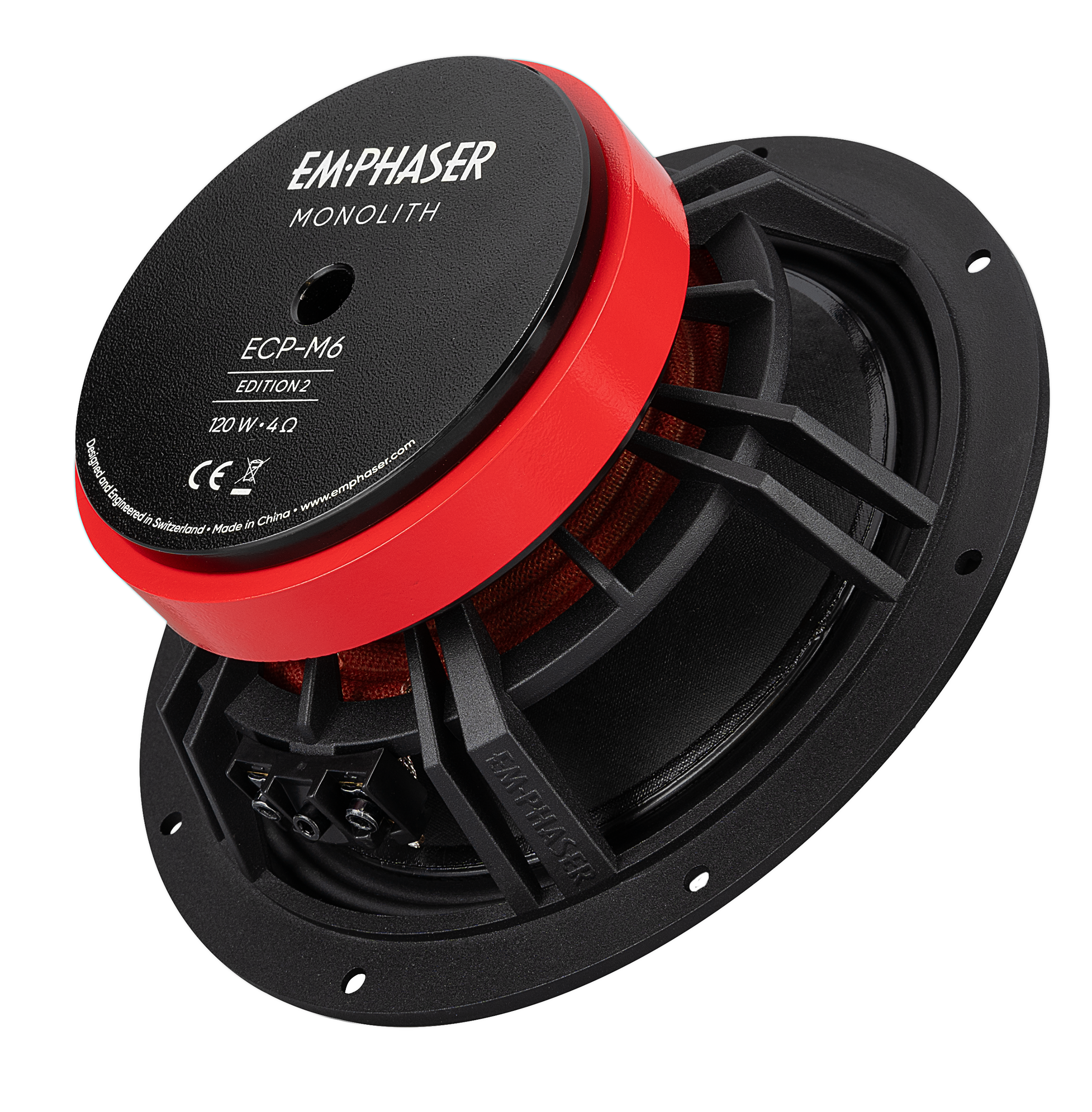 Za vysokou přesnost a přirozený zvuk modelu ECP-M6 Edition 2 vděčí nové sendvičové membráně z hliníkového papíru. Ta kombinuje vysoké tlumení a tuhost s přímou přechodovou odezvou typickou pro tvrdé membrány, což umožňuje mimořádně detailní reprodukci hudby. Tloušťka membrány je optimalizována tak, aby poskytovala jak stabilitu pro intenzivní údery basů, tak potřebnou lehkost pro přesné a přirozeně znějící středy. Odolný pryžový závěs v M-designu zajišťuje, že si ECP-M6 Edition 2 zachovává přesnou reprodukci i při vysokých úrovních a značných výkyvech membrány. Čistý, průrazný basový základ a působivé schopnosti akustického tlaku jsou umožněny výkonným magnetem ze stronciového feritu o rozměrech 100 x 15 mm, vysoce výkonnou kmitací cívkou o průměru 30 mm a 6 mm silnou, přesně frézovanou pólovou deskou wooferu. Pečlivě vybrané komponenty jsou uloženy v minimalistickém koši EMPHASER FlowMax z hliníkového tlakového odlitku J.ejí velmi otevřená konstrukce s jemnými vzpěrami poskytuje maximální prostor pro zvuk vyzařovaný dozadu a minimalizuje nežádoucí odrazové plochy, které by mohly ovlivnit kvalitu zvuku. Navzdory jemnému designu nabízí důmyslná konstrukce koše obrovskou stabilitu. Další inovací je šroubovací terminál EMPHASER: Přestože je velmi robustní, vyžaduje minimální prostor a zajišťuje bezpečný přenos signálu díky pevným šestihranným šroubům a pozlaceným kontaktním plochám.