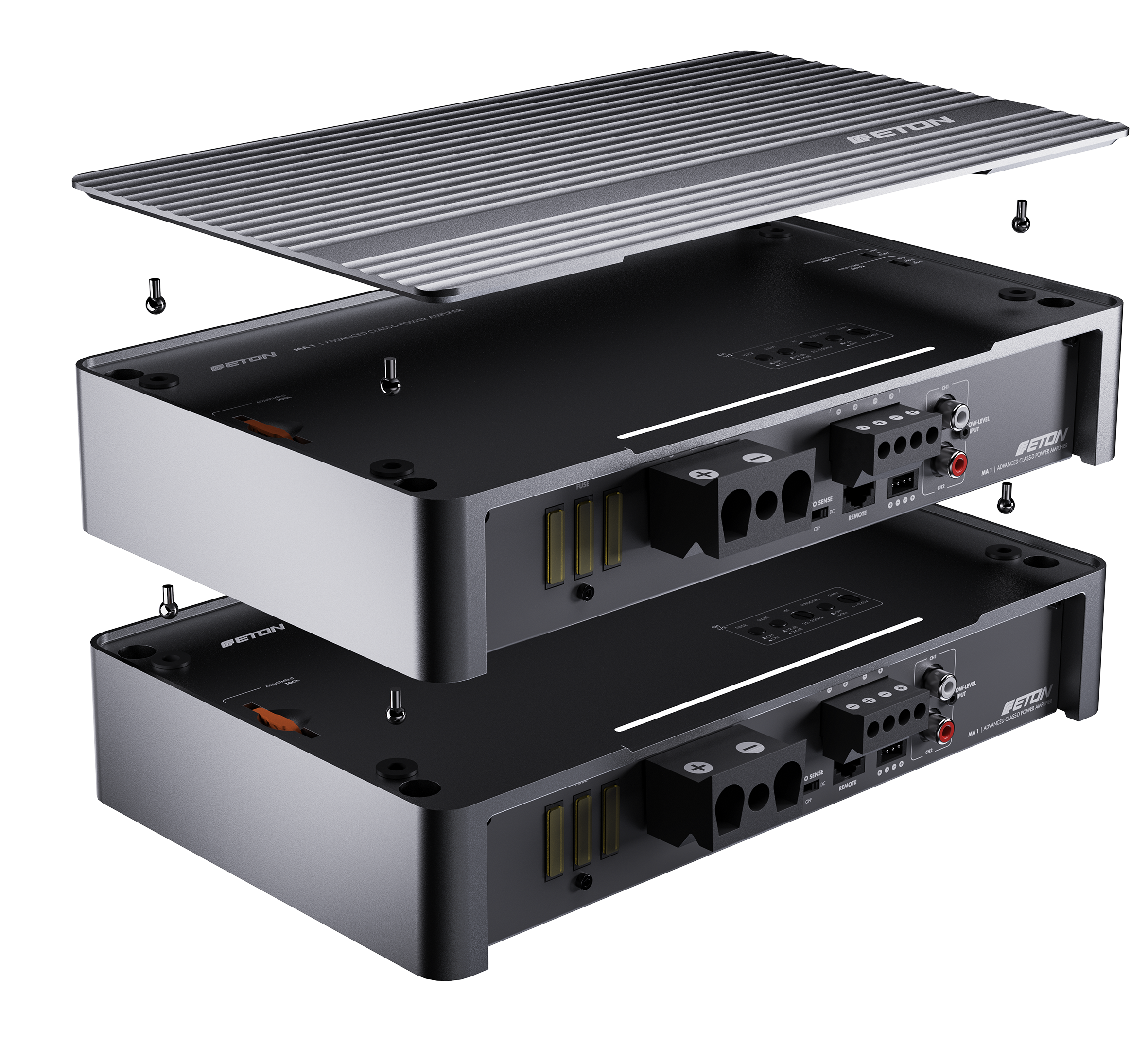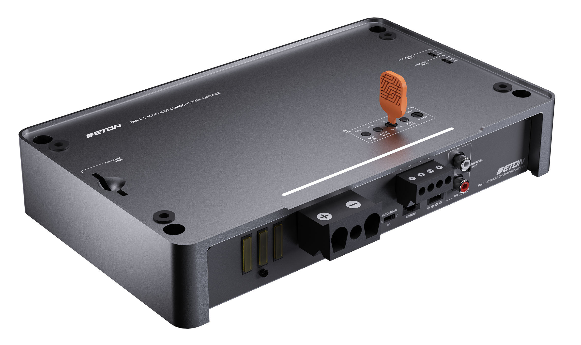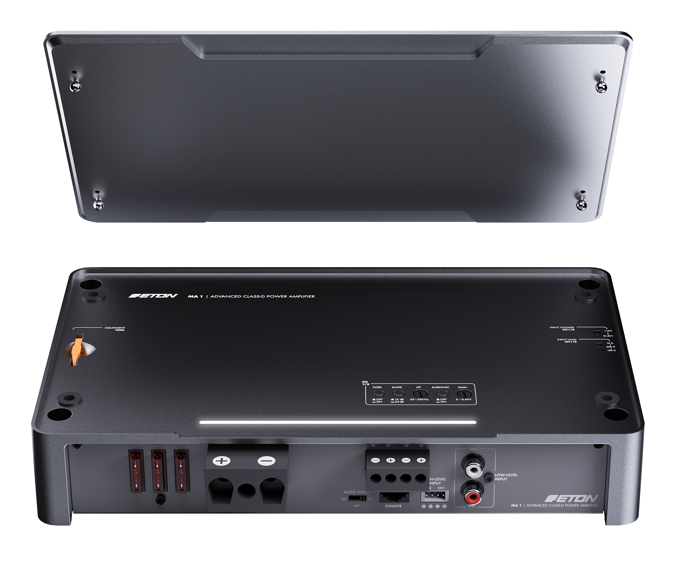 Řada zesilovačů MA nabízí špičkovou elektroniku v nádherně navrženém pouzdře z jednoduchého tlakového hliníkového odlitku, eloxovaném v matném bronzovém provedení. Skříně z litého hliníku fungují celým svým povrchem jako chladiče, což zajišťuje vysoce účinný tepelný management. Horní panel s logem ETON je odnímatelný a – což je další elegantní konstrukční řešení – lze jej otočit o 180° pro co nejlepší kosmetickou integraci v obou směrech. Zesilovače MA nabízejí horní ovládání, přičemž všechny možnosti nastavení jsou přístupné z horní strany zesilovače, ale po dokončení nastavení jsou skryty pod horní deskou. Pokrývá všechny potřeby nastavení, na které si lze vzpomenout: vysoko- a nízkofrekvenční filtry, nastavitelné vysokoúrovňové vstupní napětí, nastavitelný vysokoúrovňový vstupní odpor (zátěž EPS) a ovládání zisku.