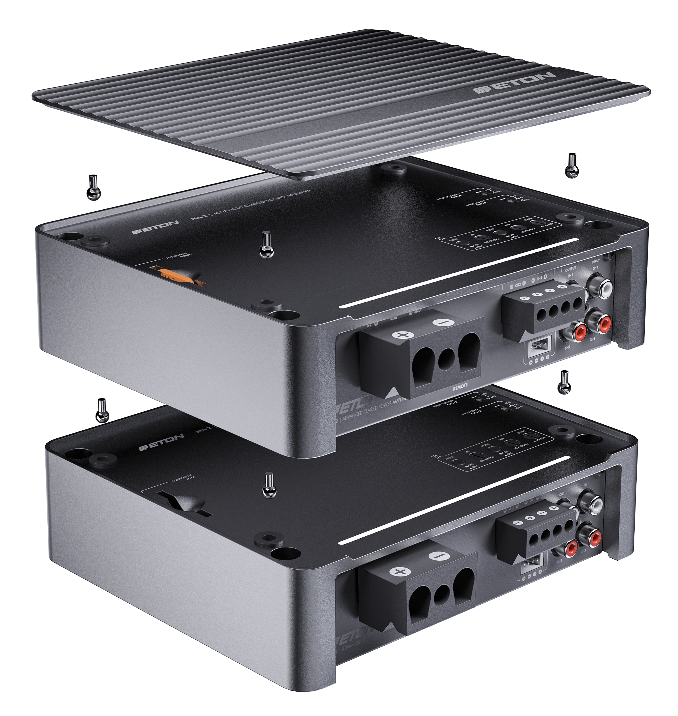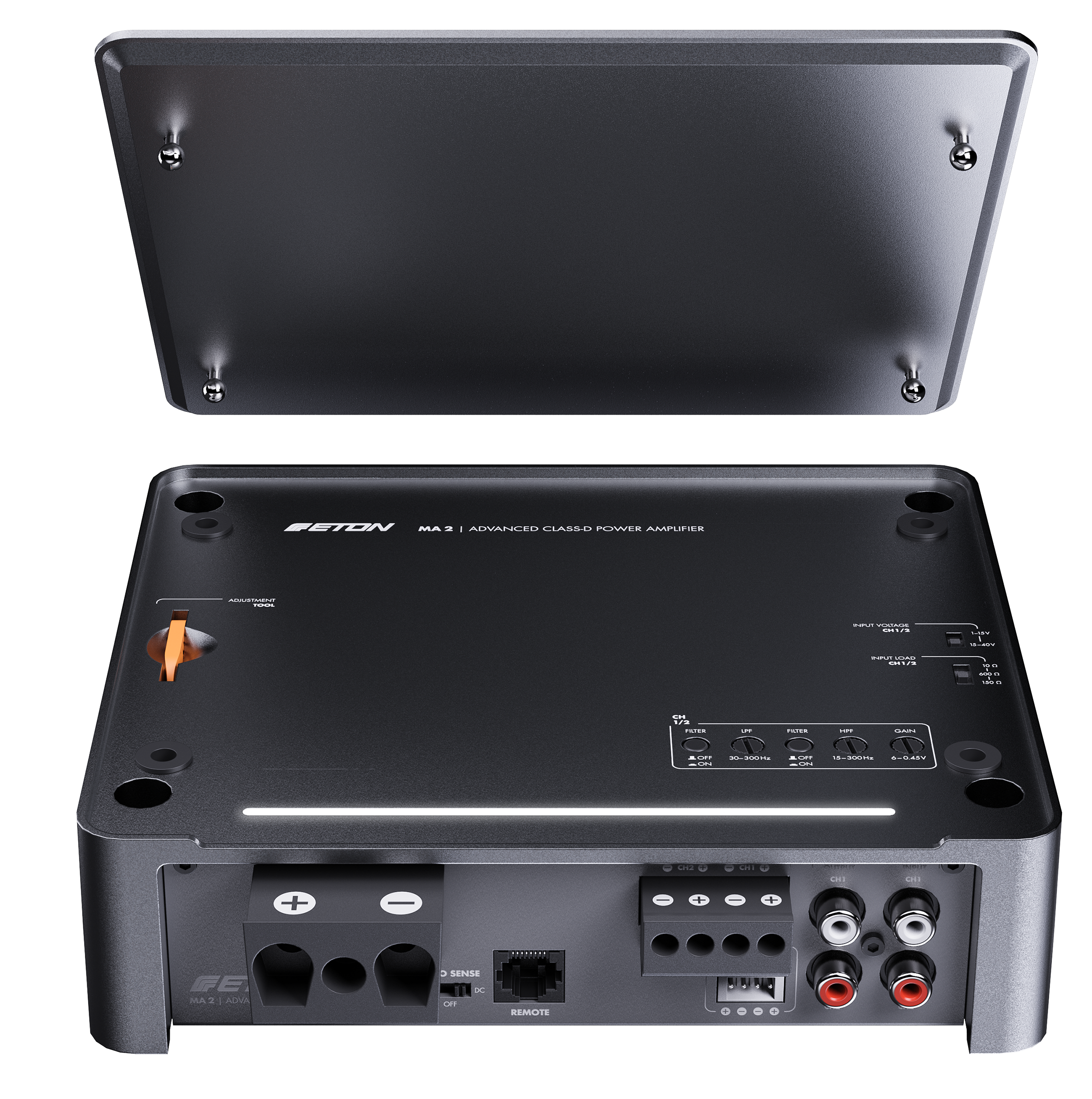 Řada zesilovačů MA nabízí špičkovou elektroniku v nádherně navrženém pouzdře z jednoduchého tlakového hliníkového odlitku, eloxovaném v matném bronzovém provedení. Skříně z litého hliníku fungují celým svým povrchem jako chladiče, což zajišťuje vysoce účinný tepelný management. Horní panel s logem ETON je odnímatelný a – což je další elegantní konstrukční řešení – lze jej otočit o 180° pro co nejlepší kosmetickou integraci v obou směrech. Zesilovače MA nabízejí horní ovládání, přičemž všechny možnosti nastavení jsou přístupné z horní strany zesilovače, ale po dokončení nastavení jsou skryty pod horní deskou. Pokrývá všechny potřeby nastavení, na které si lze vzpomenout: vysoko- a nízkofrekvenční filtry, nastavitelné vysokoúrovňové vstupní napětí, nastavitelný vysokoúrovňový vstupní odpor (zátěž EPS) a ovládání zisku.