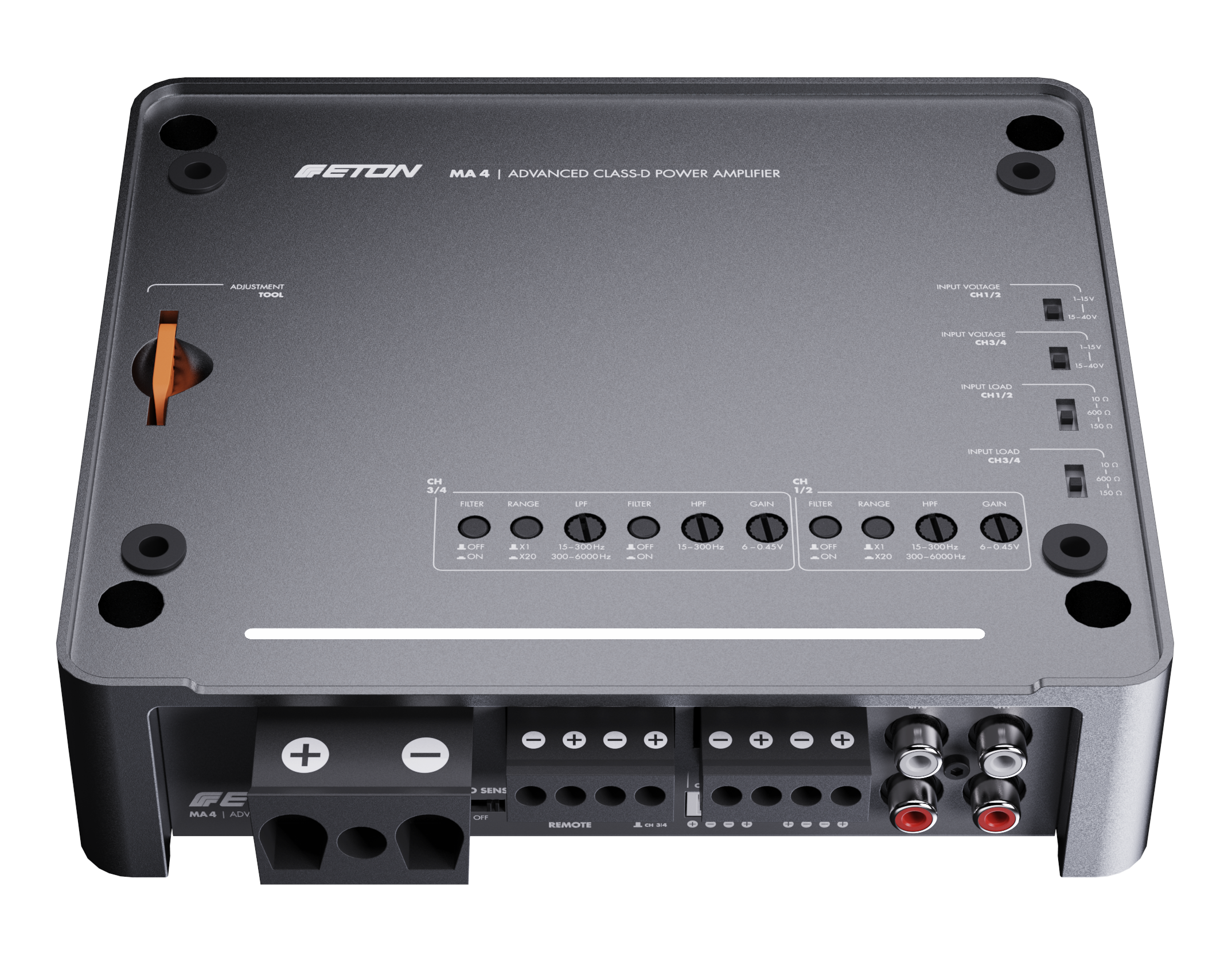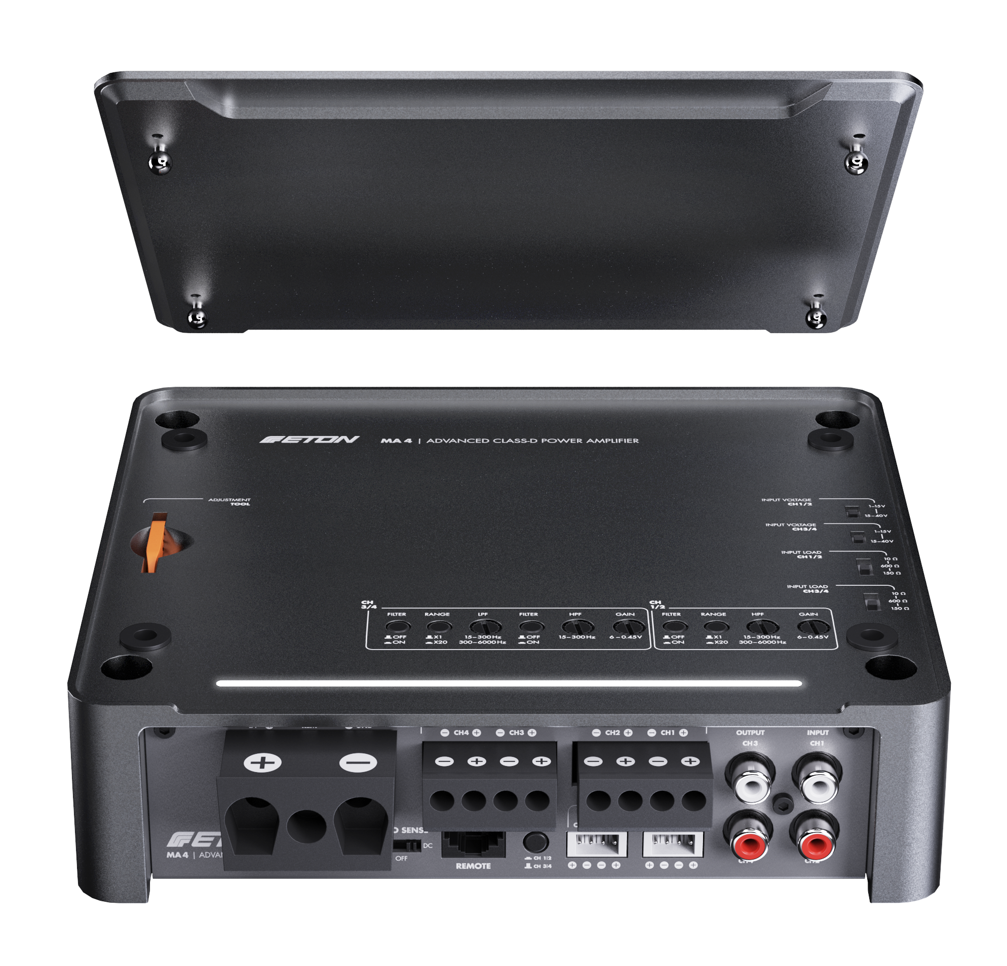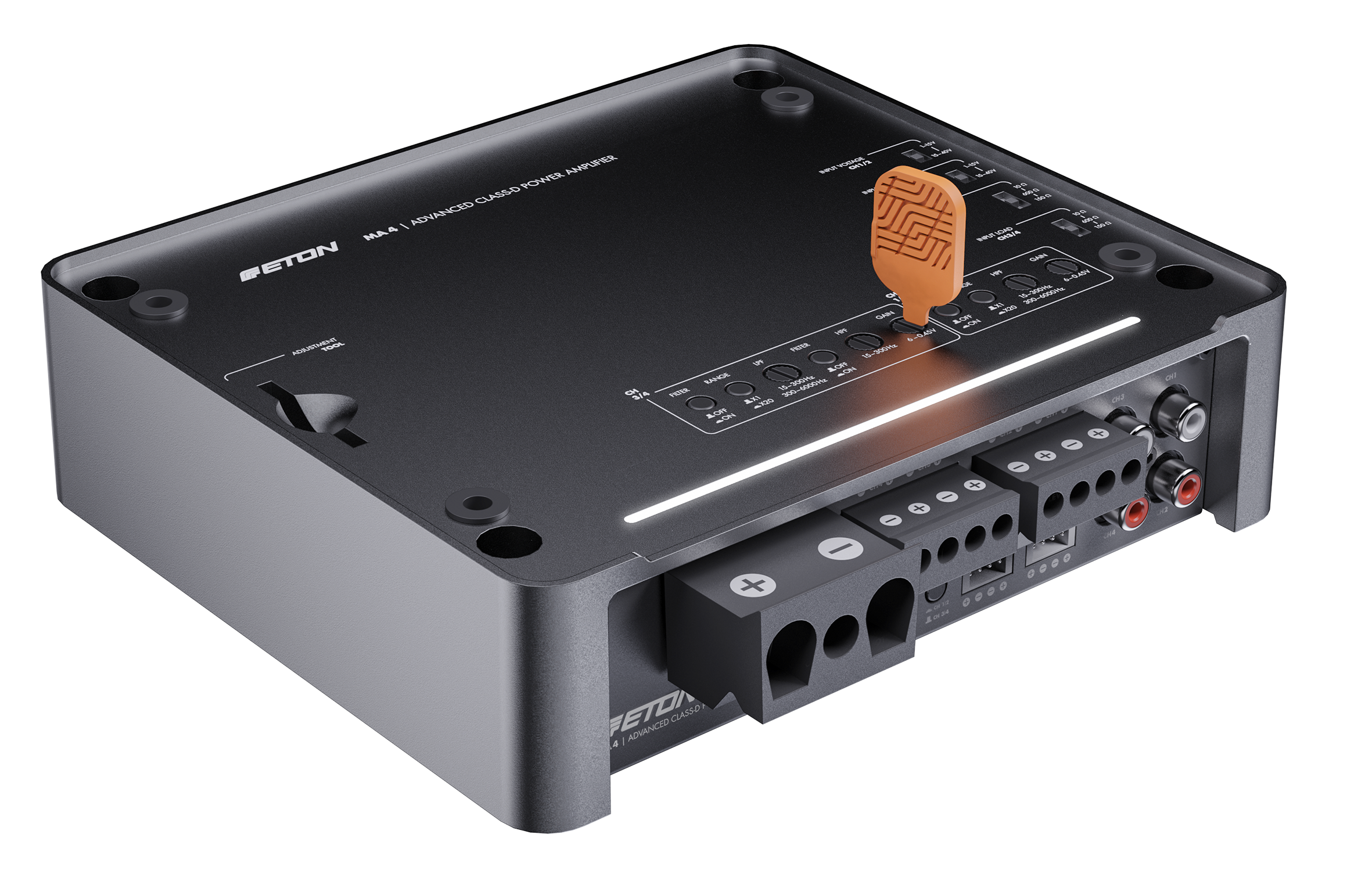 Řada zesilovačů MA nabízí špičkovou elektroniku v nádherně navrženém pouzdře z jednoduchého tlakového hliníkového odlitku, eloxovaném v matném bronzovém provedení. Skříně z litého hliníku fungují celým svým povrchem jako chladiče, což zajišťuje vysoce účinný tepelný management. Horní panel s logem ETON je odnímatelný a – což je další elegantní konstrukční řešení – lze jej otočit o 180° pro co nejlepší kosmetickou integraci v obou směrech. Zesilovače MA nabízejí horní ovládání, přičemž všechny možnosti nastavení jsou přístupné z horní strany zesilovače, ale po dokončení nastavení jsou skryty pod horní deskou. Pokrývá všechny potřeby nastavení, na které si lze vzpomenout: vysoko- a nízkofrekvenční filtry, nastavitelné vysokoúrovňové vstupní napětí, nastavitelný vysokoúrovňový vstupní odpor (zátěž EPS) a ovládání zisku.