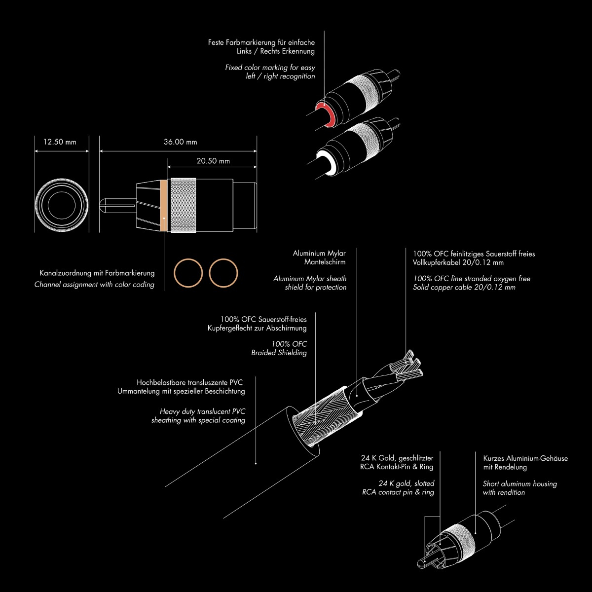 24karátově zlacené RCA kontaktní kolíky poskytují trvalou ochranu proti oxidaci a korozi. Díky nízkému přechodovému odporu umožňují bezztrátový přenos signálu. Kontaktní kolíky jsou podélně prořezané a při zasunutí se rozšiřují – stejně jako diagonálně drážkovaný prstenec vnějšího kontaktu konektoru – což zajišťuje bezpečné a pevné spojení. Protiskluzový rýhovaný profil a kompaktní rozměry (20,5 mm) umožňují snadné a flexibilní zasunutí zástrček. Průsvitný PVC plášť chrání kabely před vlhkostí a mechanickým namáháním, zároveň zajišťuje odolnost a dlouhou životnost. Speciální povrchová úprava umožňuje snadné protažení kabelu, což výrazně usnadňuje instalaci ve vozidle. Ochranu navíc zajišťují tzv. Y-slickpants na koncích kabelů – tyto koncové návleky z vysoce kvalitního silikonu jsou velmi flexibilní, odolné, teplotně rezistentní a tudíž mimořádně trvanlivé.