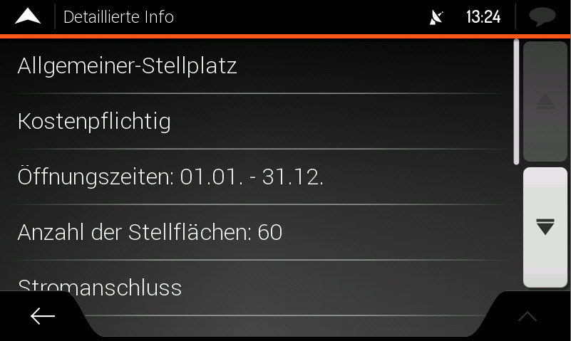 Předinstalovaný komplexní balíček Camping POI nabízí podrobné informace o kempech a stellplatzech téměř ve všech evropských zemích. Databáze zobrazuje podrobné informace o více než 20 000 kempech a destinacích.